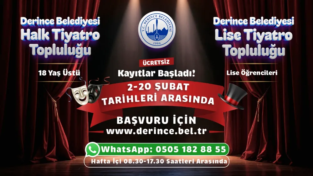 Kültürel ve sanatsal etkinliklerle adından söz ettiren Derince Belediyesi, bu kez çok önemli bir projeyi daha hayata geçiriyor. Derince Belediyesi’nin ilçe genelinde düzenleyeceği Halk Tiyatro ve Lise Tiyatro Toplulukları için ücretsiz kayıtlar başladı. 18 yaş üstü bireyleri kapsayan Halk Tiyatro Topluluğu ile lise öğrencilerini kapsayan Lise Tiyatro Topluluğu için 2 Şubat tarihinde başlayan kayıtlar 20 Şubat’a kadar devam edecek. Eğitimlere katılmak ve gösterilerde yer almak isteyenler başvurularını www.derince.bel.tr adresi üzerinden online yapabilecekleri gibi hafta için 08.30 – 17.30 saatleri arasında 0 505 182 88 55 numaralı whatsapp hattından bilgi alabilecek.