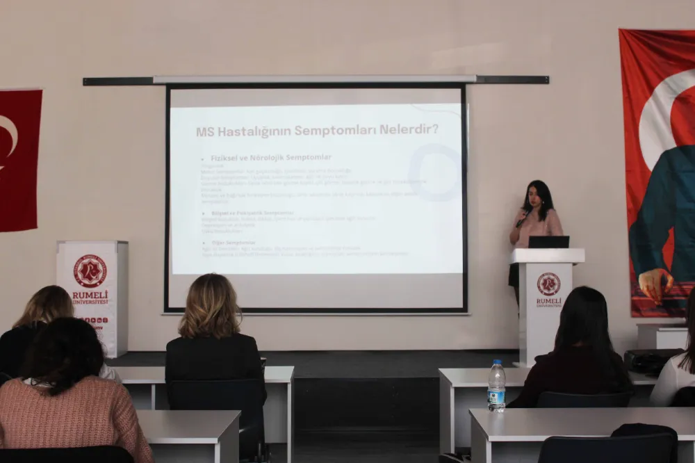 Etkinlikte, Multiple Skleroz (MS) hastalığında beslenmenin rolü ve sağlıklı yaşam alışkanlıklarının hastalık süreci üzerindeki etkileri ele alındı. Kronik bir sinir sistemi hastalığı olan MS’in tedavisinde genellikle ilaçların ön planda olduğunu belirten Arş. Gör. Sanem Güven, doğru beslenmenin ve yaşam tarzı düzenlemelerinin tedaviye güçlü bir destek sağladığını vurguladı.