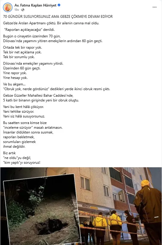 İzmit Belediye Başkanı Fatma Kaplan Hürriyet, Gebze’de yaşanan bine çökmesi ve ortaya çıkan obruklarla ilgili yazılı bir açıklama yaparak yetkililere sert sözlerle yüklendi. Fatma Başkan yaptığı açıklamada, “70 gündür susuyorsunuz ama Gebze çökmeye devam ediyor. Gebze’de Arslan Apartmanı çöktü. Bir ailenin canına mal oldu. “Raporları açıklayacağız” denildi.