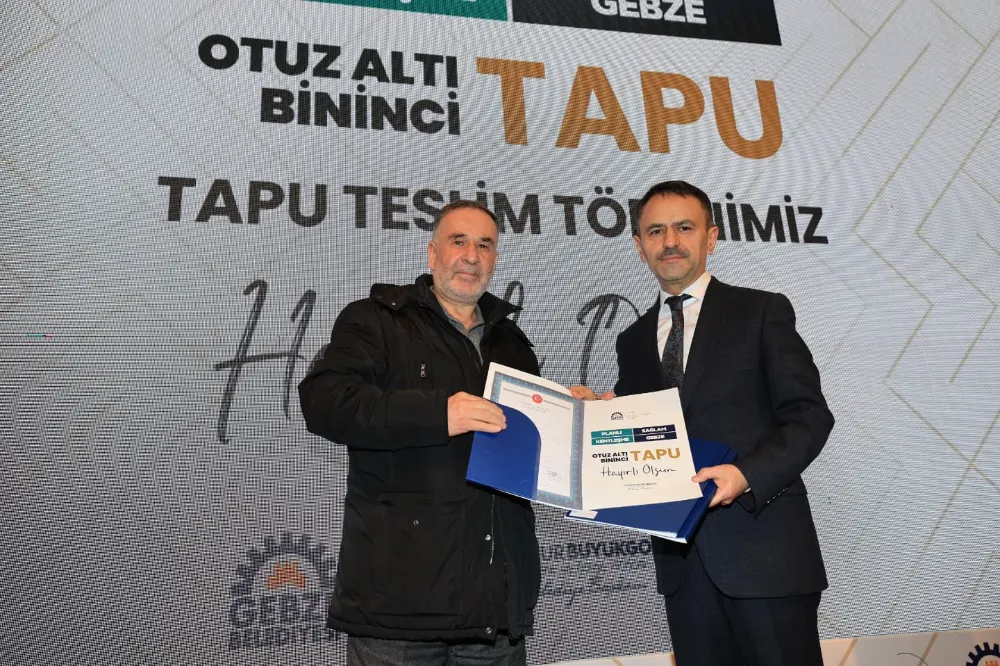 Gebze Belediyesi tarafından mahallelerde gerçekleştirilen imar uygulamaları ve şuyulandırma çalışmaları kapsamında hak sahiplerine tapuları teslim ediliyor. Gebze Belediye Başkanı Zinnur Büyükgöz’ün ev sahipliğinde kent meydanı sardunya salonunda düzenlenen 36 bininci tapu teslim törenine Ticaret Bakanı Prof. Dr. Ömer Bolat, Bakan Yardımcısı Mustafa Tuzcu, Kocaeli Valisi İlhami Aktaş, Kocaeli Büyükşehir Belediye Başkanı Tahir Büyükakın, AK Parti Kocaeli İl Başkanı Şahin Talus, AK Parti Kocaeli Milletvekili Veysal Tipioğlu, KBB Başkanvekili Hasan Soba, Gebze Kaymakamı Mehmet Ali Özyiğit, AK Parti Kocaeli İl Kadın Kolları Başkanı Yasemin Özdemir, AK Parti Gebze İlçe Başkanı Recep Kaya, MHP Gebze İlçe Başkanı Coşkun Öztürk, mahalle muhtarları, tapu sahipleri ile çok sayıda davetli katıldı.