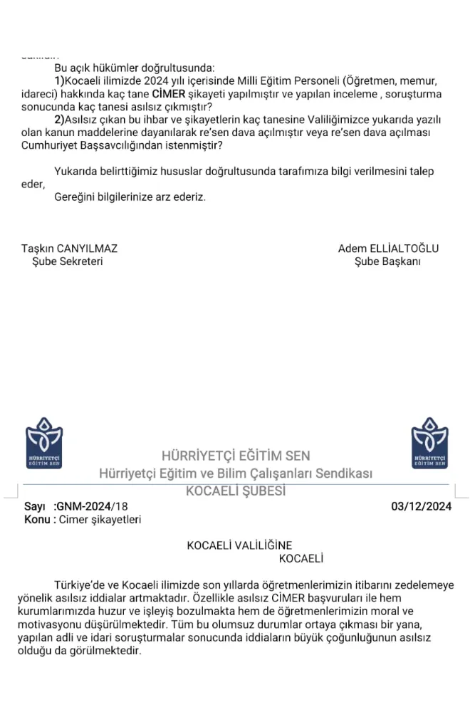 Konuyla ilgili açıklama yapan Hürriyetçi Eğitim Sen Kocaeli Şube Başkanı Adem Ellialtıoğlu, “Her gün bir okulumuza CİMER şikayeti geliyor ve çoğu asılsız, komik iddialardan ibaret. Eğitim çalışanları, CİMER tehdidiyle baskı altına alınmaya çalışılıyor. Bu durum, eğitim çalışanlarını mağdur ediyor. 657 sayılı Kanun'un 25'inci maddesinde yer alan hükümler ve 4483 sayılı Kanun’a göre, asılsız şikayetlerde bulunanlar hakkında yasal işlem yapılması gerektiği açıkça belirtilmişken, bu işlemler neden uygulanmıyor?” dedi.