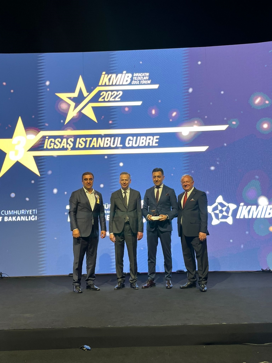Türk tarım ve sanayi sektörünün güçlü oyuncusu İGSAŞ, İstanbul Kimyevi Maddeler ve Mamulleri İhracatçıları Birliği (İKMİB) tarafından, “İKMİB İhracatın Yıldızları Ödülü”ne layık görüldü. Sektörde başarılarına bir yenisini daha ekleyen İGSAŞ, kimyevi gübre ihracatı kategorisinde ödüle layık görüldü. İKMİB 2022 İhracatın Yıdızları Ödül Törenine İGSAŞ Genel Müdürü İlkay Ünal katılırken, İGSAŞ adına ödülü Satış ve Pazarlama Direktörü Vedat Altınok aldı.