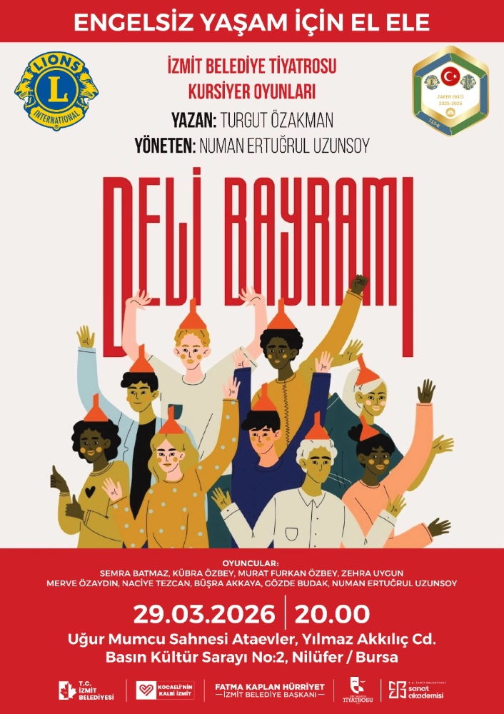 “Engelsiz Yaşam İçin El Ele” temasıyla sahnelenecek oyun, 29 Mart Pazar günü saat 20.00’de Bursa Nilüfer’de bulunan Uğur Mumcu Sahnesi’nde izleyiciyle buluşacak. Lions Kulübü Engelsiz Yaşam Koordinatörlüğü ve Yönetim Çevresi ev sahipliğinde gerçekleştirilecek anlamlı etkinlik kapsamında bilet satışından elde edilecek tüm gelir, engelli bireylerin yaşamına katkı sunmak amacıyla kullanılacak. İzmit Belediye Tiyatrosu, bu özel gösterimle yalnızca sanatsal üretimini farklı şehirlerde görünür kılmakla kalmayıp aynı zamanda sosyal sorumluluk projelerinde de aktif rol üstlenmeye devam ediyor.
