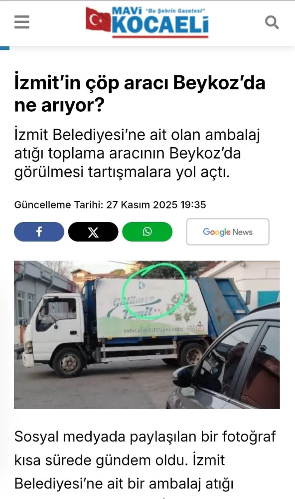 İzmit Belediyesi’nin mevcut çöp toplama ve ambalaj atığı toplama süreçleri, kendi araç ve personeli ile yürütülmektedir. Haberde geçen aracın İzmit’teki çöp toplama faaliyetleriyle hiçbir ilgisi bulunmamaktadır.
