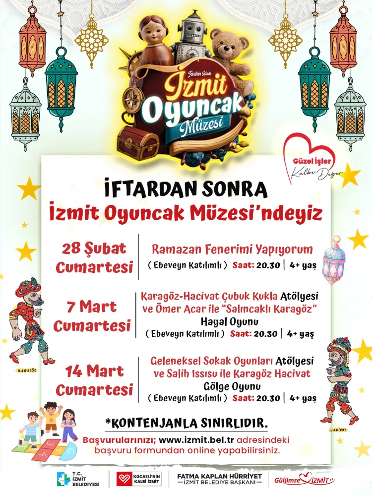 Ramazan akşamlarını kültür, sanat ve oyunla zenginleştiren “İftardan Sonra Müzedeyiz Atölyeleri”, çocukların hem eğlenmesini hem de geleneksel değerlerle bağ kurmasını amaçlıyor. İzmit Oyuncak Müzesi, tüm çocukları ve ailelerini bu özel etkinliklere davet ediyor.