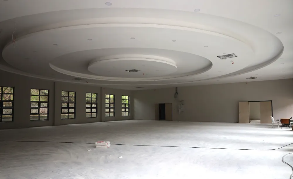 Kaba inşaat işleri, cephe kaplaması, döşeme imalatları, doğrama-kapı montajları çevre düzenlemesi, mekanik işleri tamamlanan projede; mutfak dolabı, sahne ve ıslak hacimlerde bulunan vitrifiye elemanları montajının ardından çalışmalar tamamlanacak. Bünyesinde konferans, kongre, düğün gibi organizasyonların gerçekleştirilmesine imkân verecek çok amaçlı salon, 770 metrekare alan üzerine yapılıyor. Projede düğün salonu, sahne, gelin odası, kulis, bay ve bayan tuvaletleri de yer alıyor.