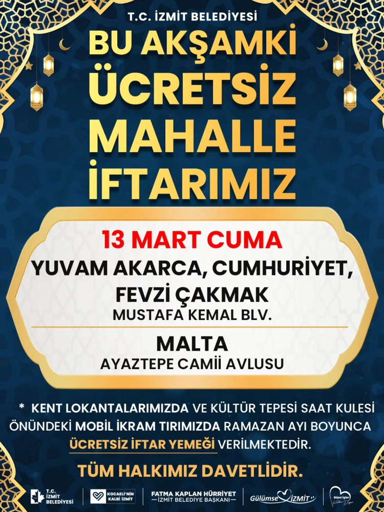 Derince Belediyesi’nin Kadir Gecesi’nin idrak edileceği 16 Mart Pazartesi günü düzenleyeceği Derince Kent İftarı’nda ilçe halkı oruçlarını hep birlikte açmanın huzurunu yaşayacak