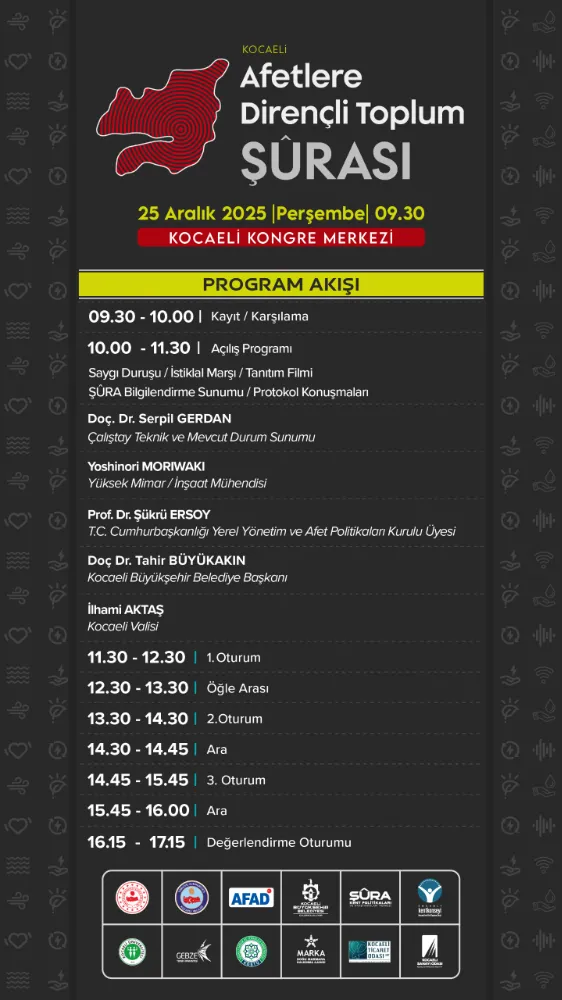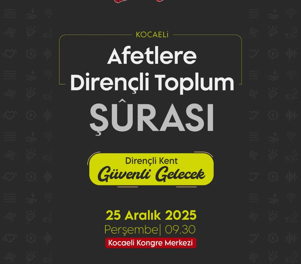 Kocaeli Büyükşehir Belediyesi, yaşanabilecek muhtemel bir afet olayı veya acil durum karşısında hazırlıklı olmak için çalışmalarını sürdürüyor. Bu kapsamda Büyükşehir öncülüğünde düzenlenecek “Afetlere Dirençli Toplum Şûrası ve Çalıştayı” 25 Aralık Perşembe günü (yarın) Kocaeli Kongre Merkezi’nde gerçekleştirilecek. Şehirde afet yönetimi kapasitesini güçlendirmeyi amaçlayan çalıştay, paydaşlar arası iş birliğini artırıp, toplumsal faydayı öncelikleyen somut politika ve proje önerileri oluşturacak.