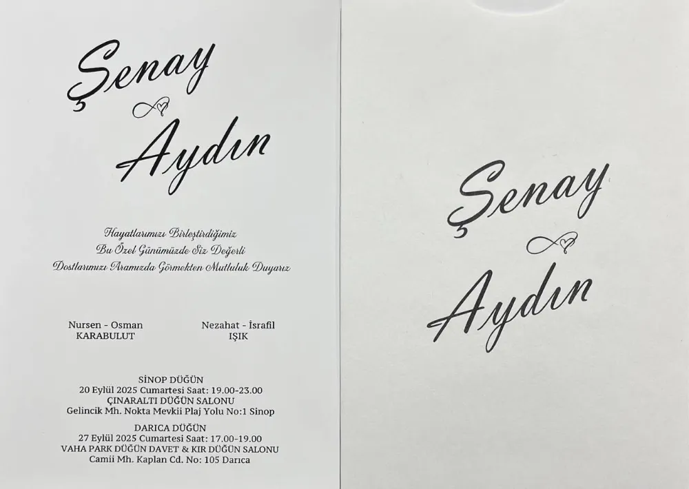 Nurten - Osman Karabulut çiftinin güzel kızları Organizasyon firması sahibi Şenay ile Nezahat - İsrafil Işık çiftinin oğulları İnşaat mühendisi Aydın Işık, 27 Eylül 2025 Cumartesi günü saat 17.00 - 19.00 arasında Darıca Vaha Park Düğün salonunda gerçekleşecek nikah töreni ile hayatlarını birleştirecek.
