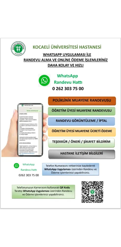 Kocaeli Üniversitesi Hastanesi'nde artık hastalar, poliklinik ve öğretim üyelerinin muayene randevularını WhatsApp üzerinden alabilecek, randevu sorgulama, iptal etme ve online ödeme işlemlerini kolayca gerçekleştirebilecekler.