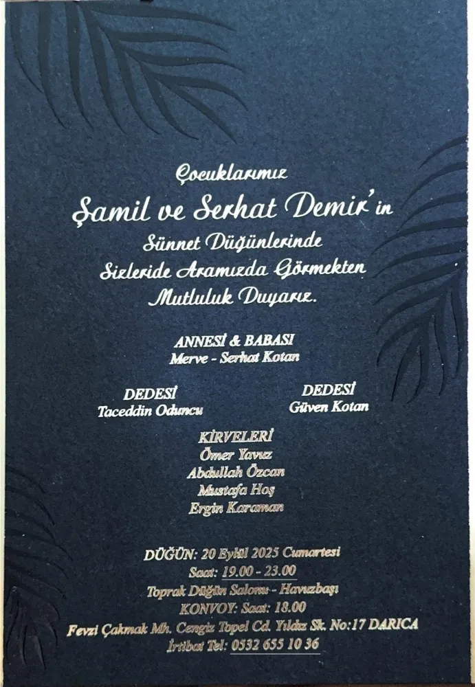 Şamil ve Serhat Demir Kotan'ın kirveliklerini; Ömer Yavuz, Abdullah Özcan, Mustafa Hoş ve Ergin Karaman’ın yapacağı sünnet düğünü 20 Eylül 2025 Cumartesi günü saat 19.00 – 23.00 arasında Osman Yılmaz mahallesinde bulunan Toprak Havuzbaşı Düğün salonunda gerçekleşecek.