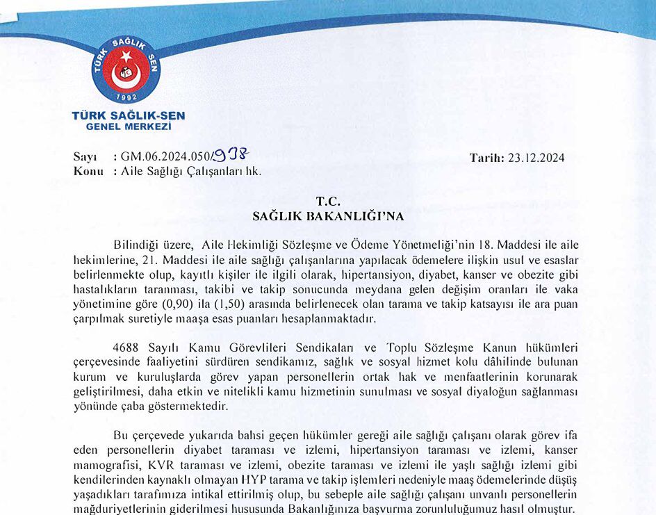 Türk Sağlık Sen Kocaeli Şube Başkanı Ömer Çeker açıklamasının devamında, “Sendikal mücadele uzun solukludur. Bizde bu mücadeleyi yılmadan çalışanın yanında doğrudan yana tavır alarak sürdürüyoruz. Sorunların tespitine ve buna yönelik girişimlerimize bugün bir yenisini daha ekledik. Aile sağlığı çalışanlarının diyabet taraması ve izlemi, hipertansiyon taraması ve izlemi, kanser mamografisi, KVR taraması ve izlemi, obezite taraması ve izlemi ile yaşlı sağlığı izlemi gibi kendilerinden kaynaklı olmayan HYP tarama ve takip işlemleri nedeniyle maaş ödemelerinde düşüş yaşadıkları görülmüştür.